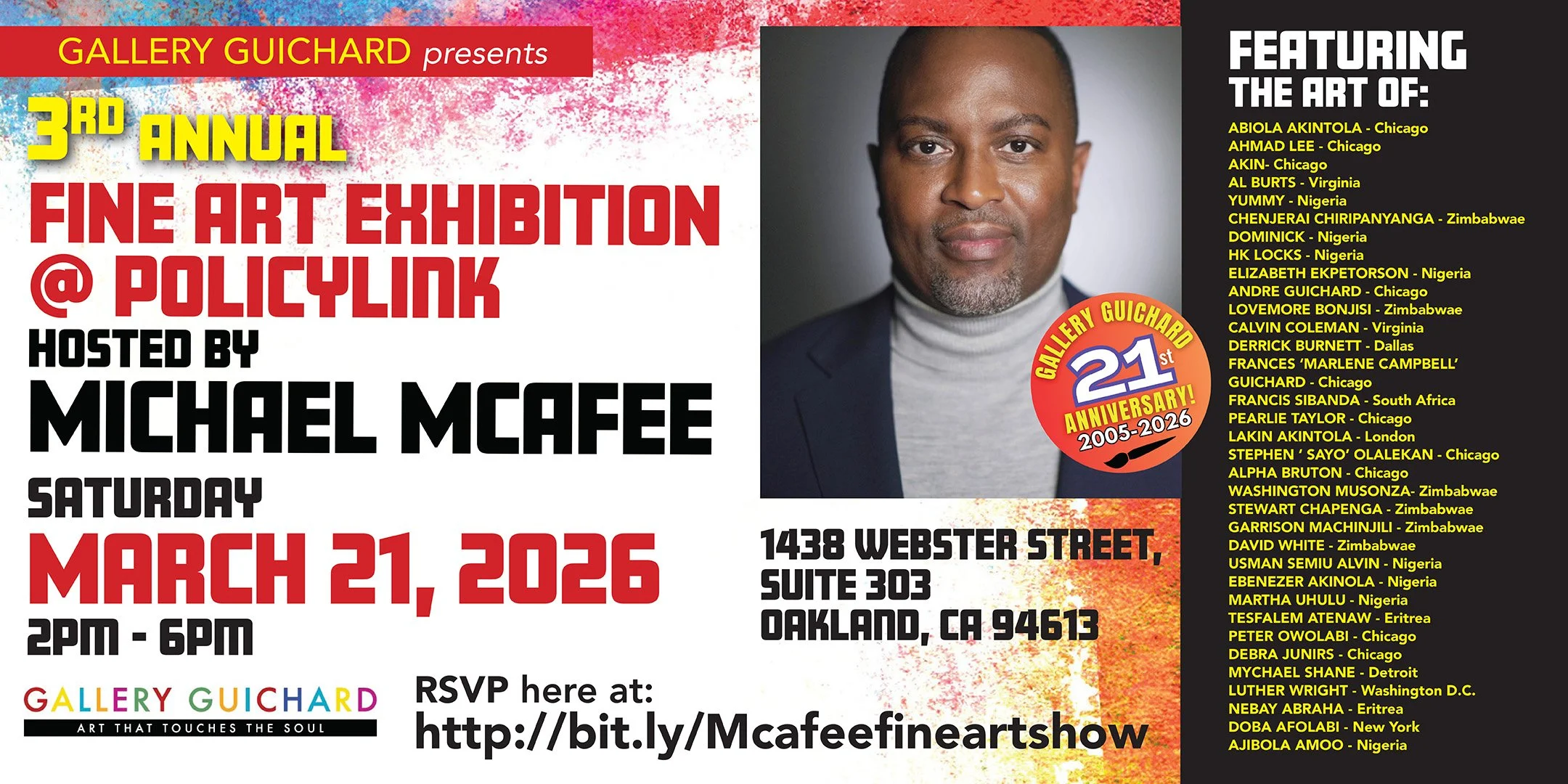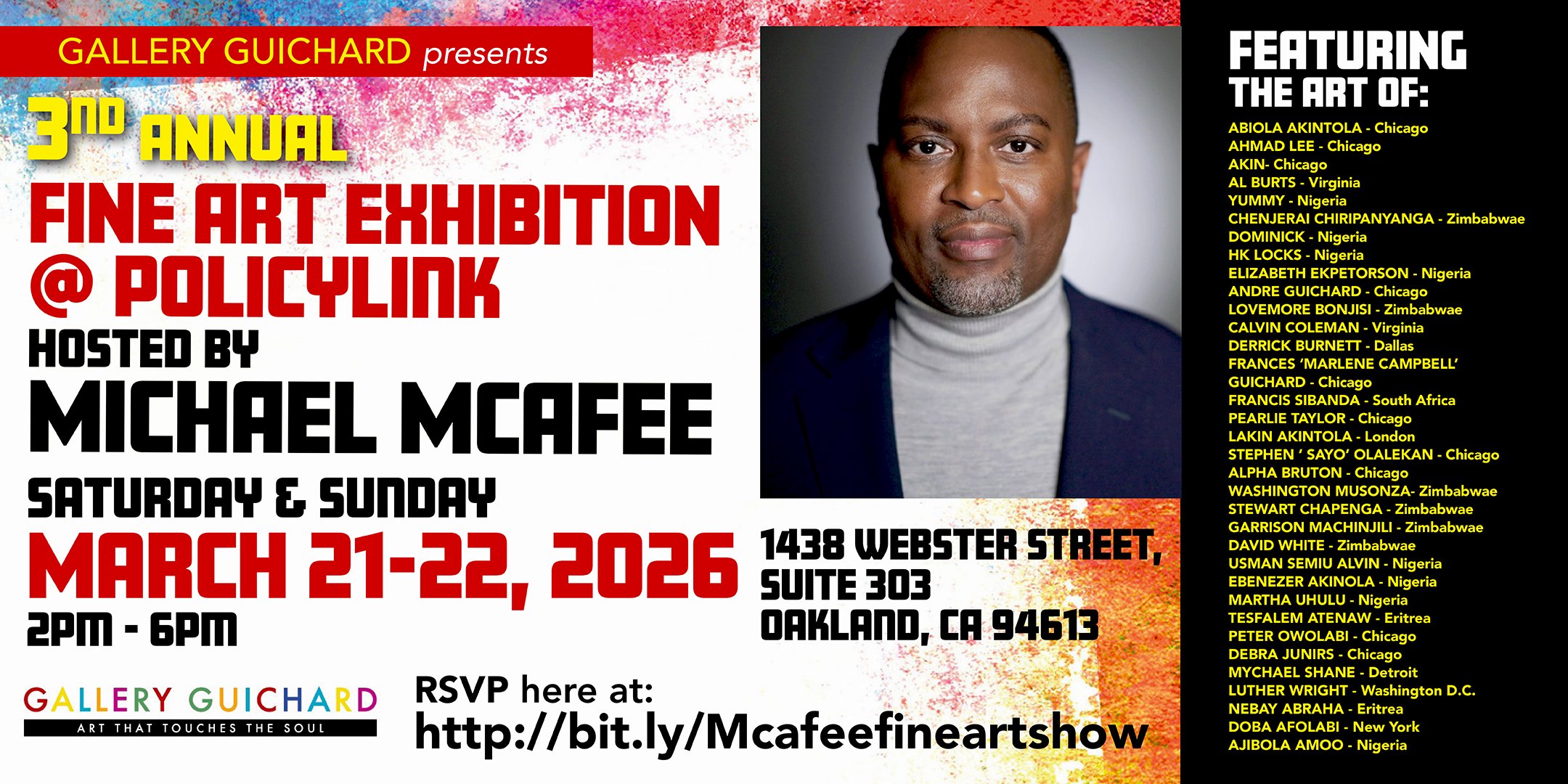 Welcome art enthusiasts! 🎨 Join Gallery Guichard Fine Art Gallery from Chicago, IL. for the 3rd Annual Fine Art Exhibition hosted by Michael McAfee at PolicyLink.