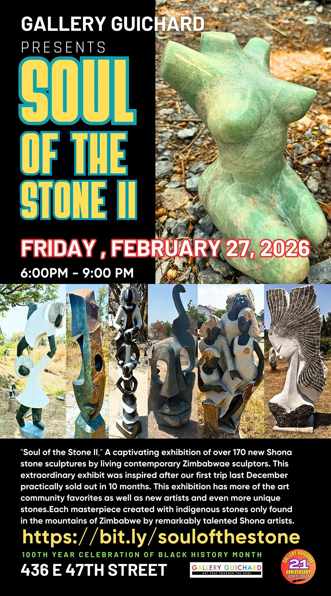 Join us FEBRUARY 27, 2026 6 pm to 9 pm at GALLERY GUICHARD Come Immerse yourself in the beauty of handcrafted original sculptures, each one a masterpiece created with indigenous stones only found in Zimbabwe by remarkably talented Shona artists. Discover the profound connection between the stone and the spiritual world, and let the artistry and history of the Shona Tribe resonate within you.This exhibition has more of the art community favorites as well as new artists and even more unique stones.